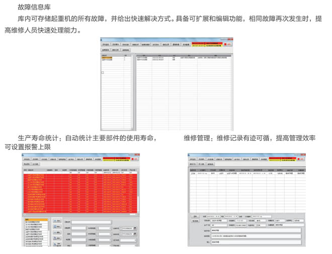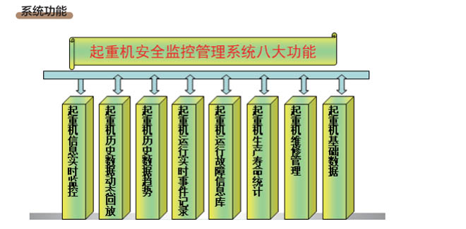 AGF系列起重機(jī)械安全監(jiān)控管理系統(tǒng)是我公司自主開發(fā)研制的產(chǎn)品,按照國質(zhì)檢特聯(lián)【2011】137號文件的要求,嚴(yán)格執(zhí)行國標(biāo):GB/T 28264-2017生產(chǎn),廣泛用于各行業(yè)大型起重設(shè)備機(jī)械、提升機(jī)、架橋機(jī)、港機(jī)、工程機(jī)械等,系統(tǒng)是為各種起重機(jī)的運(yùn)行監(jiān)視、診斷分析、設(shè)備預(yù)警與檢修維護(hù)而搭建的信息系統(tǒng)管理平臺。系統(tǒng)實(shí)時記錄起重機(jī)的運(yùn)行參數(shù)、操作記錄,當(dāng)滿足故障條件和設(shè)置預(yù)警值時,系統(tǒng)及時提醒和記錄各種事件信息,為起重機(jī)的操作人員和維護(hù)人員提供實(shí)時的、詳盡的歷史數(shù)據(jù)和分析報表。起重機(jī)安全監(jiān)控管理系統(tǒng)具有可靠穩(wěn)定性、靈活交互性、便捷易用性,是集實(shí)時監(jiān)控﹑故障報警﹑數(shù)據(jù)登錄﹑設(shè)備維護(hù)﹑運(yùn)行統(tǒng)計(jì)于一體的現(xiàn)代起重機(jī)綜合信息管理平臺。