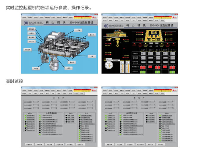 •-1、起重機(jī)狀態(tài)實(shí)時監(jiān)測:對事故易發(fā)設(shè)備和重點(diǎn)關(guān)鍵設(shè)備的運(yùn)行情況進(jìn)行實(shí)時監(jiān)測,同時 對采集的數(shù)據(jù)進(jìn)行分析整理,并把現(xiàn)場的實(shí)際數(shù)據(jù)與相關(guān)的設(shè)備運(yùn)行指標(biāo)進(jìn)行對比,超過偏 差限制時產(chǎn)生報警信息并存儲報警記錄。共享相關(guān)數(shù)據(jù),為及時發(fā)現(xiàn)和消除設(shè)備故障隱患提 供必要的數(shù)據(jù)支持。