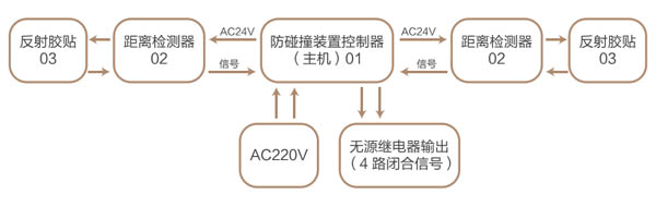 防碰撞裝置系列產(chǎn)品由防碰撞控制器(主機(jī))距離檢測器,鉆石級反射板或反射膠貼等附件組成。
