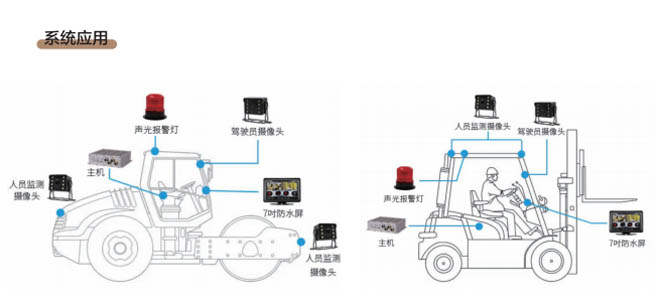 系統(tǒng)功能主要通過AI視覺圖像分析、微波雷達測距、安全警示掃描等電子信息技術(shù),結(jié)合AI技術(shù)深度學習算法以完成機器視覺的識別工作,具有報警、警示、防撞、設(shè)備管理等功能。選用自動補光的超廣角攝像機,分別安裝在車輛護頂架前后左右方,在光線不佳的環(huán)境也能夠提供人員偵測。同時對駕駛員及操作人員進行疲勞偵測,分析駕駛員狀態(tài)和行為規(guī)范。