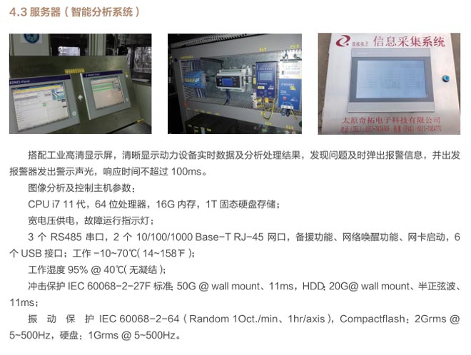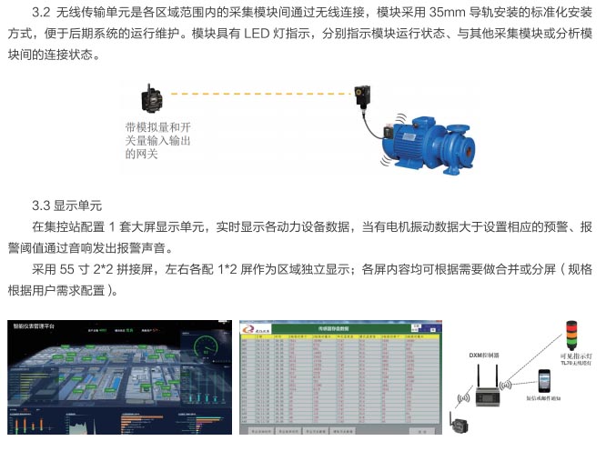 動(dòng)力設(shè)備集群智能在線監(jiān)測(cè)系統(tǒng)是通過(guò)智能遠(yuǎn)程運(yùn)維系統(tǒng)(RMS)完成工業(yè)生產(chǎn)線的電機(jī)、減速機(jī)、風(fēng)機(jī)、高低壓變電、泵閥等設(shè)備運(yùn)行狀態(tài)信息及故障信息檢測(cè),通過(guò)檢測(cè)設(shè)備的溫度、震動(dòng)、轉(zhuǎn)速、電流、電壓等數(shù)據(jù)實(shí)時(shí)分析處理運(yùn)行設(shè)備狀況,同時(shí)通過(guò)信息報(bào)警推送,智能分析設(shè)備運(yùn)行狀況并實(shí)時(shí)報(bào)警等功能,能迅速找到解決問題的方法。通過(guò)在線檢測(cè)系統(tǒng)全面實(shí)現(xiàn)對(duì)關(guān)鍵設(shè)備的全生命周期管理,提高了設(shè)備有效運(yùn)維時(shí)間和效率,降低設(shè)備運(yùn)維成本,降低設(shè)備故障時(shí)間,減少現(xiàn)場(chǎng)人員維護(hù)量,降低維護(hù)人員的依賴性。